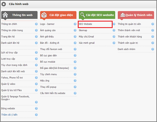 Vào mục "Cài đặt SEO Website" chọn "SEO Website".Bước 2: